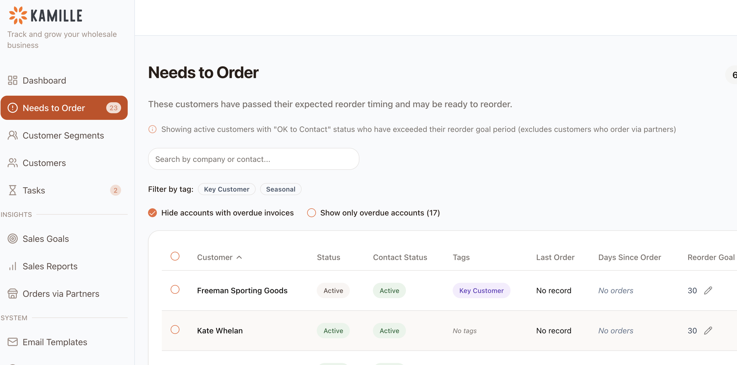 Kamille analyzes your sales data to highlight customers who may be ready to reorder — so you can follow up at the right time.